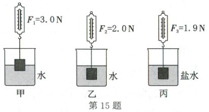 D.若图丙中弹簧测力计示数为$2.6\ N$,圆柱体浸入盐水中的体积为总体积的$\frac{2}{3}$