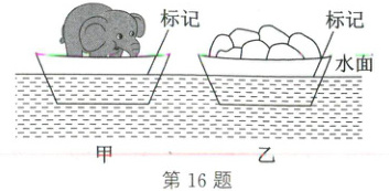 16. (2025·河南)(多选题)曹冲称象的故事广为流传。如图,称象时,先让象站在船上,在船身与水面交界处做上标记。让象上岸后,再将石头装入船中,直至船身上的标记与水面重合,所装石头的质量即为大象的质量。下列说法正确的是(