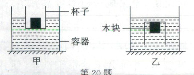 20. (2024·淮安)如图所示,甲、乙两个相同的容器分别盛有体积相同的水和盐水,静置在水平面上。现将一杯子和木块以两种方式分别放在甲、乙两容器中,甲中杯子静止时漂浮在水面上,乙中木块紧贴杯底(杯中无气体)并与杯子一起悬浮在盐水中,下列说法中正确的是(