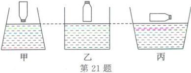 21. (2025·泸州)(多选题)在探究液体压强与容器形状关系的过程中,同学们建立了以下模型。甲、乙、丙三个容器的底面积相同而形状不同,容器中分别装有$\rho_{甲}\lt\rho_{乙}\lt\rho_{丙}$且深度相同的三种液体,将完全相同的密闭小瓶按如图方式放入液体中,均能漂浮。则放入小瓶后,下列判断正确的是(
