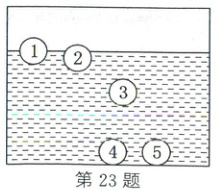 23. (2025·甘肃)小栋了解到伽利略温度计的测温原理后,想自己动手设计一个粗略测温的装置,他的设计思路如下:在密闭的玻璃容器中装上一种密度会随温度升高而减小的特殊液体,液体中有5个体积相等,密度不同且标有温度示数的小球,小球不吸收液体且热胀冷缩可以忽略不计,当有小球悬浮时,悬浮小球上标有的温度值就是当前环境的温度。如图所示为这个测温装置的示意图,其中小球3上所标温度值为$25^{\circ}C$。相邻标号的小球上所标的温度值间隔为$2^{\circ}C$,则下列说法正确的是(
