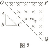 2. 如图2所示,等腰直角三角形OPQ区域内存在匀强磁场,另有一等腰直角三角形导体线框ABC以恒定的速度沿垂直于磁场方向穿过磁场,穿越过程中速度始终与AB边垂直且保持AC平行于OQ。关于线框中的感应电流,以下说法中正确的是(