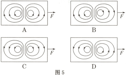 4. (2025·河南高考)如图4所示,一金属薄片在力F作用下自左向右从两磁极之间通过。当金属薄片中心运动到N极的正下方时,沿N极到S极的方向看,图5中能够正确描述金属薄片内涡电流绕行方向的是(