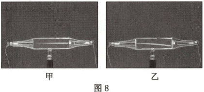 8.如图8甲所示为一阴极射线管,接通电源后,电子射线由阴极向右射出,在荧光屏上会看到一条亮线。要使荧光屏上的亮线向下偏转,如图8乙所示。在下列措施中可采用的是 ( )