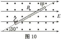 10.(2025·洛阳模拟)如图10所示,空间中存在水平向右的匀强电场和垂直于纸面向外的匀强磁场。在该空间中固定一光滑绝缘管道,管道轴线与水平方向夹角为$30°$。一带电小球先在管外以速度$v_0$做直线运动,轨迹与管道轴线重合,如图中虚线所示,之后小球穿入管中,管道内径略大于小球直径。下列说法正确的是 (