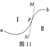 11.如图11所示,在区域Ⅰ和区域Ⅱ内分别存在着与纸面垂直的匀强磁场,一带电粒子沿着弧线$apb$由区域Ⅰ运动到区域Ⅱ。已知圆弧$ap$与圆弧$pb$的弧长之比为$2:1$,下列说法正确的是 (