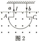 金属线$a$、$b$连接并悬吊,半圆环的直径$AC$水平静止在磁感应强