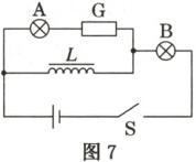 7.A 解析:开关S闭合瞬间,电源的电压同时加到两灯泡上,灯泡A、B同时亮,随着L中电流的增大,由于线圈L直流电阻可忽略,分流作用增大,灯泡A 逐渐被短路直到熄灭,外电路总电阻减小,总电流增大,灯泡B变亮,故A正确,B错误;开关S断开瞬间,灯泡B立即熄灭,线圈中电流减小,产生自感电动势,感应电流流过灯泡A,灯泡A闪亮一下后逐渐熄灭,即G中电流突然增大,但方向向左,故C、D错误。