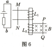 6.C 解析:根据安培定则可知,MN处于ab产生的垂直向里的磁场中,MN在磁场力作用下向右运动,说明MN受到的磁场力向右,由左手定则可知,电流由M指向N,线圈L1中感应电流的磁场向上,由楞次定律可知,线圈L2中产生的磁场应该是向上减小,或向下增加;再由右手定则可知,PQ可能是向右减速运动或向左加速运动,故C正确,A、B、D错误。