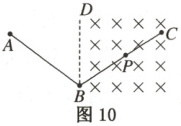 10.AD 解析:小球在运动过程中受重力、洛伦兹力和轨道支持力作用,因洛伦兹力永不做功,支持力始终与小球运动方向垂直,也不做功,即只有重力做功,满足机械能守恒,因此C点与A点等高,在同一水平线上,选项A正确;小球向右或向左滑过B 点时速度等大反向,即洛伦兹力等大反向,小球对轨道的压力不等,选项B错误;同理小球向上或向下滑过P点时,洛伦兹力也等大反向,选项C错误;因洛伦兹力始终垂直于BC,小球在AB段和BC段(设斜面倾角均为θ)的加速度均由重力沿斜面的分力产生,大小为gsinθ,由x = $\frac{1}{2}$at²,得小球从A点到B点的时间是从C点到P点的时间的$\sqrt{2}$倍,选项D正确。