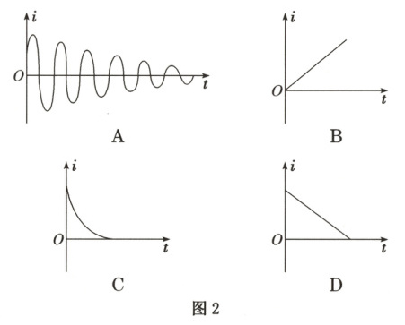 2. (2025·江苏高考)如图 1 所示,将开关 S 由 a 拨到 b,使电容器 C 与线圈 L 构成回路。以电容器 C 开始放电取作 0 时刻,图 2 中能正确反映电路中电流 i 随时间 t 变化关系的图像是(