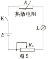 6. 如图 5 所示是测试热敏电阻 R 的实验电路图,滑动变阻器 R_L 已调节到某一适当的值。实验中观察到当温度升高时灯泡更亮。下列对实验现象分析正确的是(