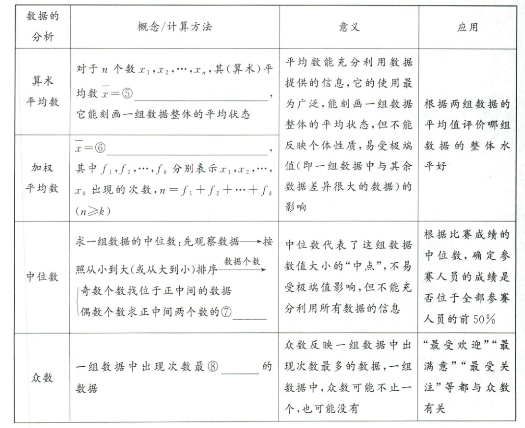 ⑤$\frac{1}{n}(x_1+x_2+·s+x_n)$ ⑥$\frac{1}{n}(x_1f_1+x_2f_2+·s+x_kf_k)$ ⑦平均数 ⑧多
