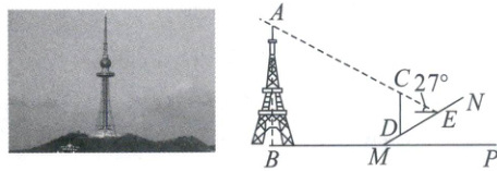 如图,在距某信号塔 $AB$($AB$ 垂直地面 $BP$)的底部点 $B$ 的右侧 $30m$ 处有一个斜坡,斜坡 $MN$ 的坡度 $i$ 为 $1:2.4$,斜坡上 $4m$ 处有一竖直广告牌 $CD$(即 $MD = 4m$,$CD \perp BP$)。已知当阳光与水平线夹角成 $27^{\circ}$ 时,信号塔的影子顶端正好和广告牌的顶端影子重合于点 $E$(即点 $A$,$C$,$E$ 在同一条直线上),经测量 $DE$ 的长度为 $9m$,求信号塔 $AB$ 的高度。(结果保留整数)