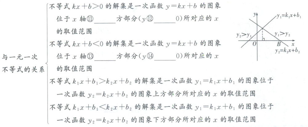 2. 与二元一次方程组的关系:二元一次方程组 $\begin{cases}y = k_1x + b_1 \\ y = k_2x + b_2\end{cases}$ 的解是一次函数 $ y = k_1x + b_1 $ 与 $ y = k_2x + b_2 $ 的图象的交点坐标。