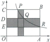[解析] 通过设辅助变量,得到有关的点的坐标,再利用“面积”列方程、求解。设$OE = ED = DC = m$,则$P(\frac{k}{3m}, 3m)$,$Q(\frac{k}{2m}, 2m)$,$R(\frac{k}{m}, m)$,$\therefore CP = \frac{k}{3m}$,$DQ = \frac{k}{2m}$,$ER = \frac{k}{m}$。$\because$图中阴影部分图形的面积为$12$,$\therefore \frac{k}{3m} × m + (\frac{k}{2m} - \frac{k}{3m}) × 3m + (\frac{k}{m} - \frac{k}{2m}) × m = 12$,解得$k = 9$。