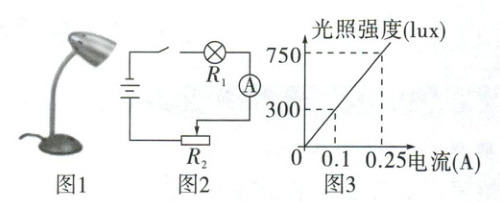 (2)根据图3,光照强度适宜人眼阅读的电流的取值范围为$0.1A \leq I \leq 0.25A$。$\because I = \frac{9}{R}$,$\therefore R = \frac{9}{I}$。$\because 9 > 0$,$\therefore R$随$I$的增大而减小,$\therefore$当$I = 0.1A$时$R$值最大,$R_{最大} = \frac{9}{0.1} = 90\Omega$;当$I = 0.25A$时$R$值最小,$R_{最小} = \frac{9}{0.25} = 36\Omega$,$\therefore 36\Omega \leq R \leq 90\Omega$。$\because R = R_2 + 5\Omega$,$\therefore 36\Omega \leq R_2 + 5\Omega \leq 90\Omega$,$\therefore R_2$的取值范围为$31\Omega \leq R_2 \leq 85\Omega$。