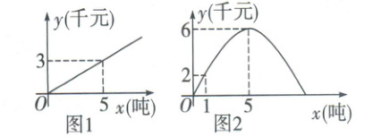 根据对某市相关的市场物价调研,预计进入夏季后的某一段时间,某批发市场内的甲种蔬菜的销售利润 $y_1$(千元)与进货量 $x$(吨)之间的函数 $y_1 = kx$ 的图象如图1所示,乙种蔬菜的销售利润 $y_2$(千元)与进货量 $x$(吨)之间的函数 $y_2 = ax^2 + bx$ 的图象如图2所示。