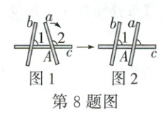 8. (2025·甘肃)如图1,三根木条$a$,$b$,$c$相交成∠1=80°,∠2=110°,固定木条$b$,$c$,将木条$a$绕点A顺时针转动至如图2所示,使木条$a$与木条$b$平行,则可将木条$a$旋转()