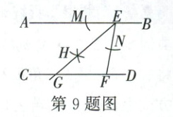 9. (2025·内蒙古)如图,直线AB//CD,点E,F分别在直线AB,CD上,连接EF,以点E为圆心,适当长为半径画弧,交射线EA于点M,交EF于点N,再分别以点M,N为圆心,大于$\frac{1}{2}MN$的长为半径画弧(两弧半径相等),两弧在∠AEF的内部相交于点H,画射线EH交CD于点G,若∠AEF=80°,则∠EGF的度数为()
