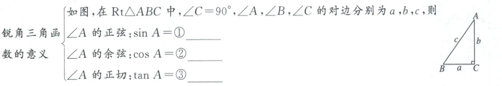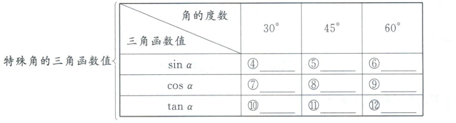 ①$\frac{a}{c}$ ②$\frac{b}{c}$ ③$\frac{a}{b}$ ④$\frac{1}{2}$ ⑤$\frac{\sqrt{2}}{2}$ ⑥$\frac{\sqrt{3}}{2}$⑦$\frac{\sqrt{3}}{2}$ ⑧$\frac{\sqrt{2}}{2}$ ⑨$\frac{1}{2}$ ⑩$\frac{\sqrt{3}}{3}$ ⑪1 ⑫$\sqrt{3}$