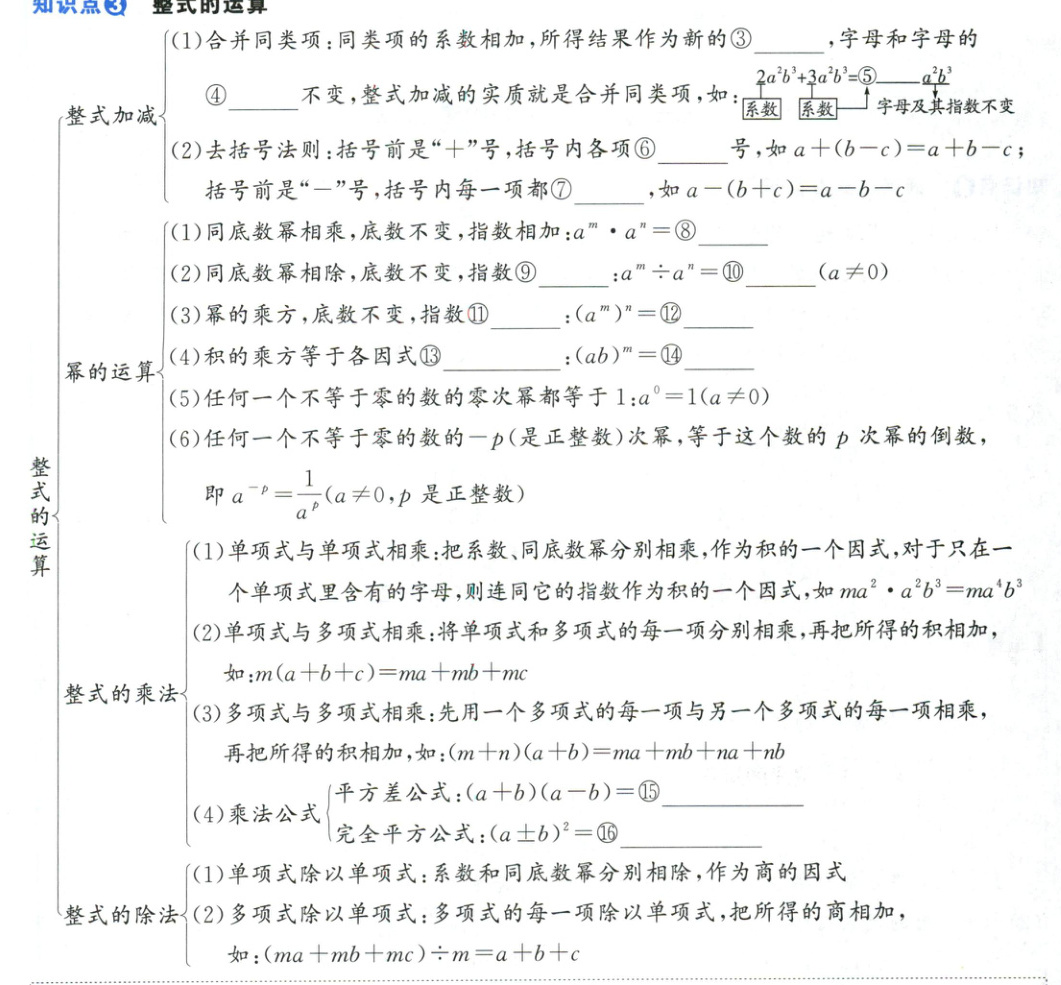 公式法:$a^{2}-b^{2}\xrightleftharpoons[整式乘法]{因式分解}$⑱;$a^{2}\pm2ab + b^{2}\xrightleftharpoons[整式乘法]{因式分解}$⑲。