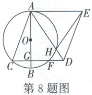 8.($2025·$重庆)如图,$AB$是$\odot O$的直径,点$C$在$\odot O$上,连接$AC$. 以$AC$为边作菱形$ACDE$,$CD$交$\odot O$于点$F$,$AB\perp CD$,垂足为$G$. 连接$AD$,交$\odot O$于点$H$,连接$EH$. 若$AG = 12$,$GF = 5$,则$DF$的长度为