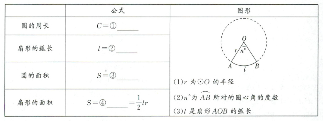 ①$2\pi r$ ②$\frac{n\pi r}{180}$ ③$\pi r^{2}$ ④$\frac{n\pi r^{2}}{360}$