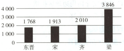 1.C 据本题图文信息可知,在东晋至梁的近两百年间,佛寺的数量由1768所增长到3846所,可见佛教在中国的发展迅速,影响力增强,逐渐融人中国社会,C项正确;从图表信息可知,佛寺数量显著增长,反映佛教影响力的扩大,而非儒学地位丧失,排除A项;题干及图表主要讨论佛寺数量变化,未涉及文化重心转移的具体内容,排除B项;所学历史知识可知,此时期佛教发展主要体现在国内融合,图表未提及佛教外传信息,排除D项。故选C项。