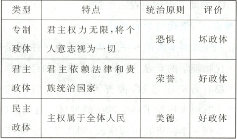9. (2025 湖南长沙长郡中学统考)如表为孟德斯鸠考察历史和现实后关于国家政体的划分。由此推知,孟德斯鸠(