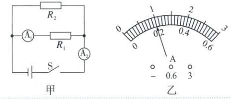 1. (2025·凉山州)在如图甲所示电路中,电源电压恒定,定值电阻$R_1$的阻值为$20\ \Omega$。闭合开关$S$,两电流表的指针均指在如图乙所示的位置。则电源电压为