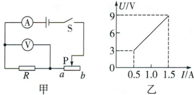 4. 如图甲所示的电路中,电源电压保持不变,闭合开关后,滑动变阻器的滑片$P$从$b$端滑到$a$端,电压表示数与电流表示数的变化关系如图乙所示,则下列说法正确的是