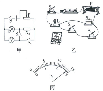 (3)保持滑片$P$的位置不变,断开开关$S_1$,闭合开关$S_2$,电压表的示数如图丙所示,该示数为