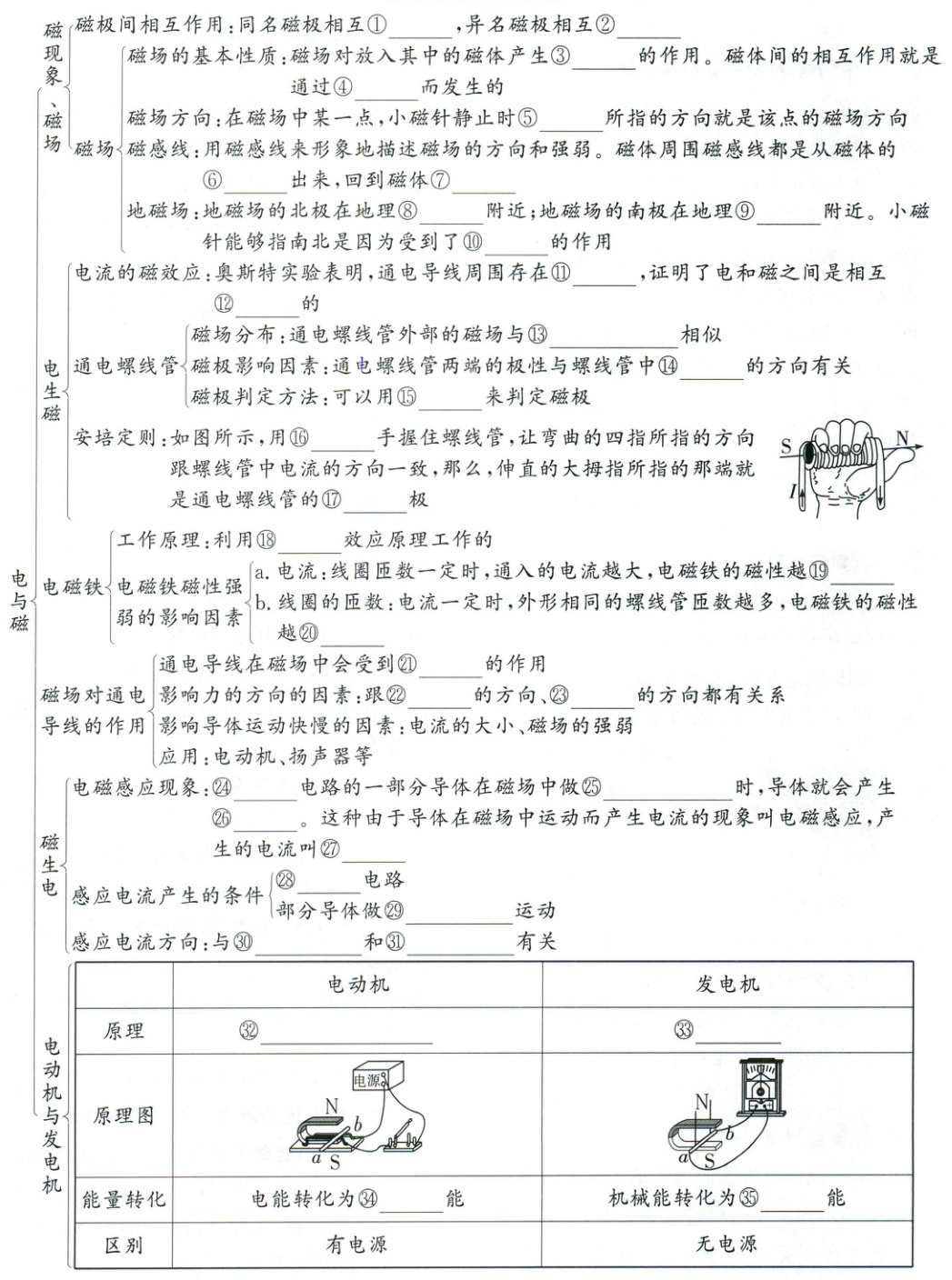 ⑱电流的磁 ⑲强 ⑳强 ㉑力 ㉒电流 ㉓磁场 ㉔闭合 ㉕切割磁感线运动 ㉖电流 ㉗感应电流 ㉘闭合