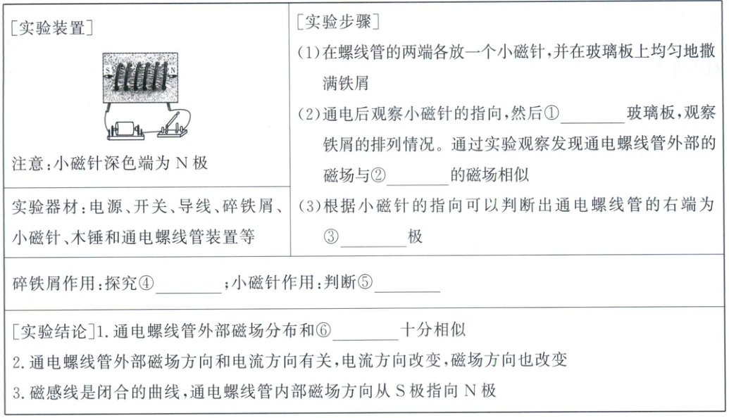 实验1 ①轻敲 ②条形磁体 ③N ④磁场分布⑤磁场的方向 ⑥条形磁体