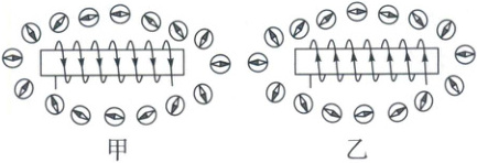 ④闭合开关后,发现只有最左侧的小磁针的指向反转过来,上下的小磁针几乎不动,将滑动变阻器乙上下的接线互换,上下的小磁针指向反转过来,而左侧的小磁针几乎不动,由此可看出滑动变阻器外部的磁场与_的磁场相似,同时发现滑动变阻器两端的磁极与_有关。