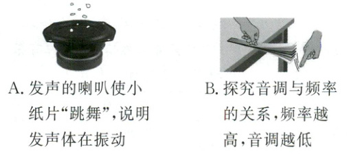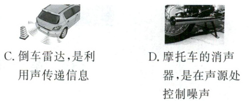 [解析]声音是由物体的振动产生的,发声的喇叭使小纸片“跳舞”,说明发声体在振动,这里运用了转换法,故A正确,不符合题意;探究音调与频率的关系,尺子伸出桌面越长,频率越低,音调越低,故B错误,符合题意;声音可以传递信息和能量,倒车雷达,是利用声传递信息,故C正确,不符合题意;摩托车的消声器,是在声源处控制噪声,防止噪声产生,故D正确,不符合题意。