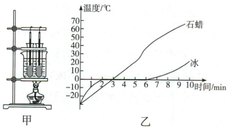 (9)[新考法]小明为了探究晶体和非晶体的熔化规律,对实验装置进行重新组装,将质量相同的冰和石蜡分别装在两个相同的试管中,放在一个装有水的大烧杯中进行加热,如图甲所示。根据实验数据绘制熔化图像,如图乙所示。