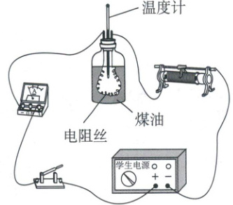7. (2025·安徽)小张同学利用如图所示的实验装置测量煤油的比热容。实验中,在一段时间内电阻丝产生$400J$的热量,质量为$0.04kg$的煤油温度升高了$5^{\circ}C$,若电阻丝产生的热量全部被煤油吸收,则煤油的比热容为_