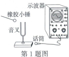 1. (2025·安徽)如图所示,用橡胶小锤敲击音叉,音叉发出的声音用话筒接收,将声信号转换成电信号,这个带有声音特征的电信号通过示波器中的波形图显示出来。下列说法正确的是()