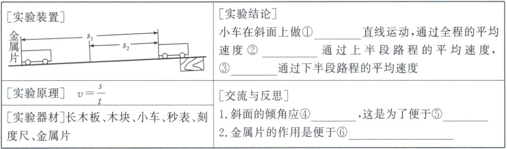 实验 ①变速 ②大于 ③小于 ④小一些 ⑤计时 ⑥确定小车运动的距离和计时