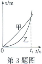 3.D [解析]在路程—时间图像中,倾斜直线表示物体做匀速直线运动,曲线表示物体做变速运动。由题图可知,甲物体的运动图像是一条倾斜的直线,表示甲做匀速直线运动;乙物体的运动图像是曲线,表示乙做变速运动,故 A 错误。平均速度的计算公式是 $v = \frac{s}{t}$。在 $0\sim t_1$ 时间内,甲、乙两物体的起点和终点相同,即路程相等,根据平均速度公式可知,它们在 $0\sim t_1$ 时间内的平均速度相等,故 B、C 错误,D 正确。