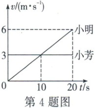 4.A [解析]由题图可知,小芳以 $3 m/s$ 的速度做匀速直线运动,小明从静止开始做加速运动,$10 s$ 末时速度为 $3 m/s$,此时小芳和小明的速度相等,由于 $0\sim10 s$ 时间内,小明的速度一直小于小芳的速度,两人所通过的路程不相等,故 A 错误,符合题意,C、D 正确,不符合题意;第 $15 s$ 末,小明的速度大于小芳的速度,以小明为参照物,小芳是向南运动的,故 B 正确,不符合题意。