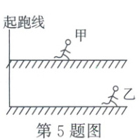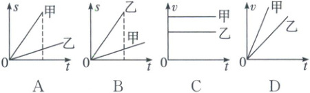 5. (2025·九江一模)甲、乙两位同学进行百米赛跑,假如把他们的运动近似看作匀速直线运动处理,他们同时从起跑线起跑,经过一段时间后他们的位置如图所示,分别作出在这段时间内两人运动路程 $ s $、速度 $ v $ 与时间 $ t $ 的关系图像,正确的是()