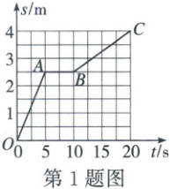 1.大于 $0.2$ [解析]根据题图可知,$OA$ 段的平均速度 $v_{OA} = \frac{s_{OA}}{t_{OA}} = \frac{2.5 m}{5 s} = 0.5 m/s$,$BC$ 段的平均速度 $v_{BC} = \frac{s_{BC}}{t_{BC}} = \frac{1.5 m}{10 s} = 0.15 m/s$,所以 $OA$ 段的平均速度大于 $BC$ 段的平均速度。$0\sim20 s$ 内的平均速度 $v = \frac{s}{t} = \frac{4 m}{20 s} = 0.2 m/s$。