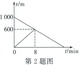 2.C [解析]由题可知小萌放学回家全程做匀速直线运动,根据图像一条斜线表示物体做的是匀速直线运动可知,学校离家为 $1000 m$,故 A 错误;由图像可知一条斜线表示物体做的是匀速直线运动,小萌放学回家,$8 min$ 处遇到了爸爸,那么小萌 $8 min$ 走的路程 $s_{萌} = 1000 m - 600 m = 400 m$,小萌放学回家全程做匀速直线运动,说明小萌的速度不变,得 $v_{萌} = \frac{s_{萌}}{t_{萌}} = \frac{s_{萌}'}{t_{萌}'}$,代入数据可得,小萌从学校到家所用时间 $t_{萌}' = \frac{s_{萌}'}{s_{萌}} × t_{萌} = \frac{1000 m}{400 m} × 8 min = 20 min$,故 B 错误;由题图可知爸爸从家去学校接小萌,走了 $8 min$ 遇到了小萌,则 $t_{爸} = t_{萌}$,那么爸爸爸爸 $8 min$ 走的路程 $s_{爸} = 600 m$,那么爸爸 $0\sim8 min$ 的速度 $v_{爸} = \frac{s_{爸}}{t_{爸}} = \frac{600 m}{8 × 60 s} = 1.25 m/s$,故 C 正确;爸爸接到小萌后和小萌一起回家,那么遇到小萌后,爸爸的速度和小萌一样,即 $v_{爸}' = v_{萌} = \frac{400 m}{8 × 60 s} \approx 0.83 m/s \neq 1.25 m/s$,$8 min$ 后,爸爸的速度变慢,整个过程中,爸爸不是做匀速直线运动,故 D 错误。