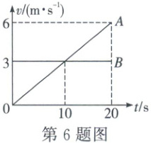 6.A [解析]①由 $v - t$ 图像可知,B 同学的运动图像是一条平行于横轴的直线,说明 B 同学速度一定,做匀速直线运动,速度为 $3 m/s$,A 同学的运动图像是一条过原点的斜线,说明 A 同学做加速直线运动,②$0\sim10 s$,A 同学的速度小于 B 同学速度,B 在前 A 在后,以 A 同学为参照物,B 同学向前运动,二者间距逐渐拉大,第 $10 s$ 末,两人的速度相等,此刻二者相对静止,二者之间距离最大,$10\sim20 s$,A 同学的速度大于 B 同学速度,B 在前 A 在后,二者间距逐渐缩小,以 A 同学为参照物,B 同学向后运动,第 $20 s$ 末,两人相遇,由以上分析可知:$10 s$ 时两人相距最远,故 A 正确;以 A 同学为参照物,B 同学不是一直向前运动的,故 B 错误;$10 s$ 时,两人速度相同,两人相距最远,故 C 错误;A 同学做加速直线运动,故 D 错误。