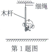 1. (2024·安徽)如图所示,一根有一定质量的木杆竖直悬挂在细绳下端,一只质量为 10 kg 的猴子抱住木杆处于静止状态。某一瞬间细绳突然断了,猴子本能地立即沿木杆使劲往上爬。在爬的过程中,若木杆始终竖直,猴子与地面的高度一直保持不变,$ g $ 取 10 N/kg,则该过程中猴子所受摩擦力的大小为