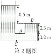2.D [解析]深度是指从自由液面到某处的竖直距离,A处水的深度$h_A = 0.5\ m + 0.3\ m = 0.8\ m$,B处水的深度$h_B =0.5\ m$,B处水的压强$p_B = \rho_水gh_B = 1.0 × 10^3\ kg/m^3 ×9.8\ N/kg × 0.5\ m = 4.9 × 10^3\ Pa$,C处水的深度$h_C =0.5\ m + 0.3\ m + 0.2\ m = 1\ m$,C点所在水平表面受到水的压力$F = p_CS = \rho_水gh_CS = 1.0 × 10^3\ kg/m^3 × 9.8\ N/kg ×1\ m × 10 × 10^{-4}\ m^2 = 9.8\ N$。综上所述,D选项正确。