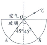 [解析]光从玻璃斜射入空气中,在玻璃与空气的交界面上发生折射和反射,过$O$点作分界面的垂线即法线,反射角为$45^{\circ}$,反射角等于入射角,则入射角为$45^{\circ}$,入射光线和反射光线分别位于法线两侧,画出入射光线$AO$;由光的折射规律可知,入射光线和折射光线分别位于法线两侧,折射角大于入射角,故折射光线应远离法线,据此画出折射光线$OC$。